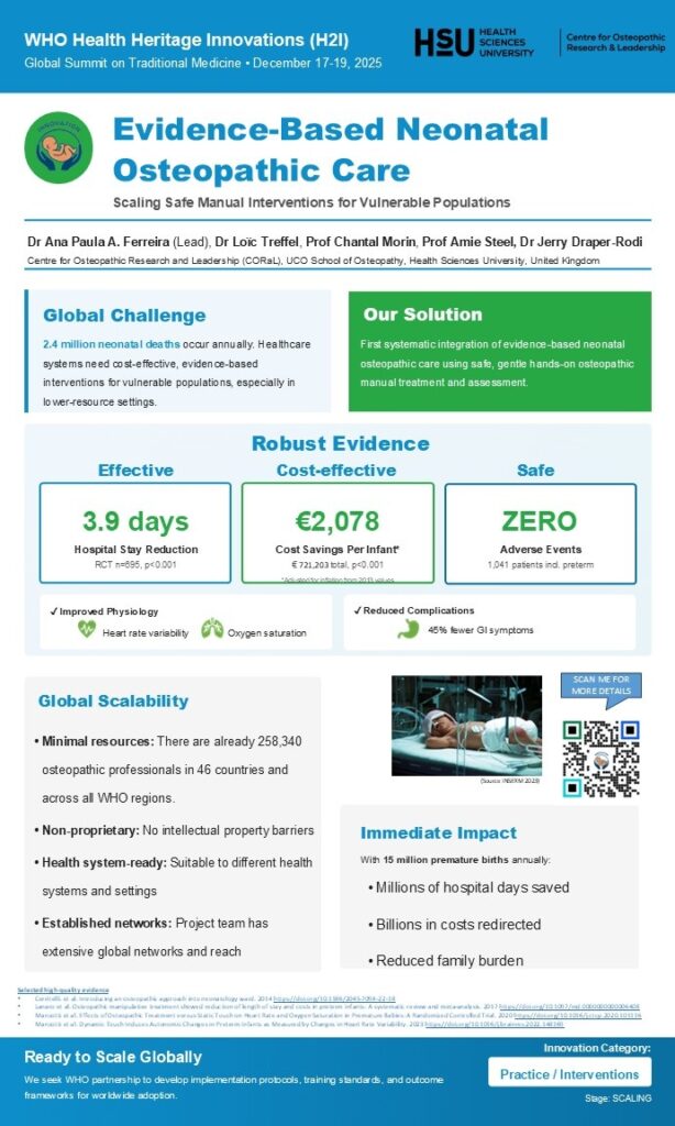 The Global Evidence-Based Neonatal Osteopathic Care Framework represents a pioneering approach to improving outcomes for the world’s most vulnerable patients: newborn infants requiring intensive care. Developed by the Centre for Osteopathic Research and Leadership (CORaL) at UCO School of Osteopathy, United Kingdom, this innovation is the first systematic integration of robust clinical evidence with practical global implementation protocols for osteopathic care in neonatal settings.